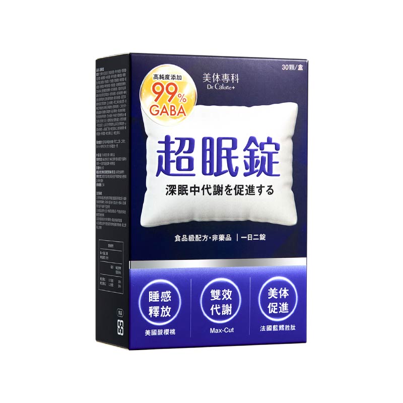 成分:分離大豆蛋白(含麩胺酸、天冬胺酸、精胺酸、白胺酸、離胺酸、絲胺酸、苯丙胺酸、脯胺酸、纈胺酸、異白胺酸、丙胺酸、甘胺酸、酪胺酸、蘇胺酸、組胺酸、胱胺酸、甲硫胺酸、色胺酸)、麩胺酸發酵物(含GABA)(麩胺酸發酵物、麥芽糊精)、南非醉茄萃取粉(南非醉茄萃取粉、麥芽糊精)、專利武靴葉萃取物(武靴葉萃取物、麥芽糊精)、葛花萃取物(葛花萃取物、玉米糊精)、麥芽糊精、聚乙烯吡咯烷酮、羊角豆萃取物(羊角豆萃取物、麥芽糊精)、二氧化矽、硬脂酸鎂、酸櫻桃萃取物、斐濟果粉、黑胡椒萃取物(黑胡椒萃取物、玉米澱粉、特級冷壓橄欖油、維生素E(抗氧化劑))、藍鱈胜肽(鱈魚蛋白、麥芽糊精、阿拉伯膠)、山茶花籽萃取物(山茶花籽萃取物、γ-環狀糊精)、γ-胺基丁酸、維生素B12(麥芽糊精、檸檬酸鈉、檸檬酸、維生素B12)、維生素B1