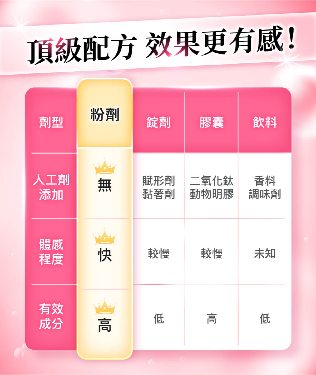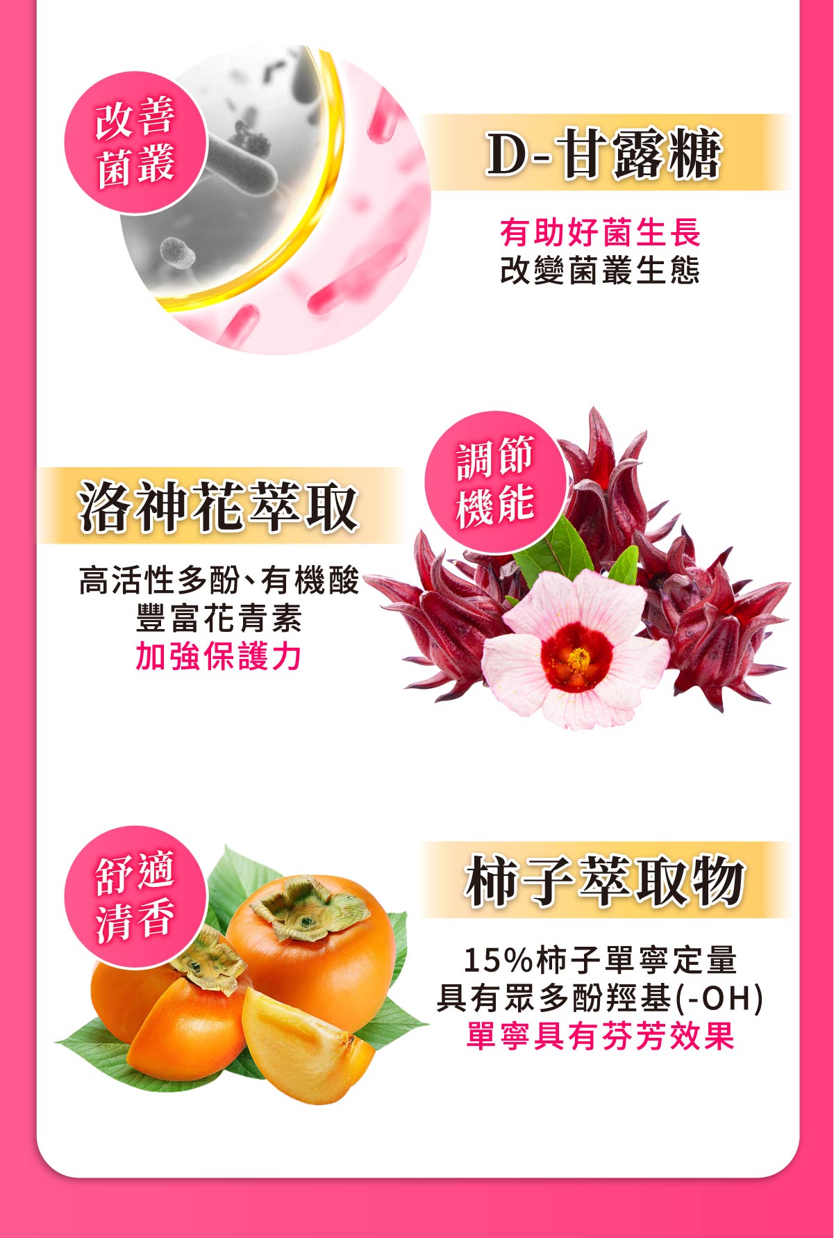 成分:蔓越莓萃取粉(蔓越莓萃取粉、麥芽糊精)、蔓越莓萃取物、乳酸菌(乳酸菌(植物乳桿菌、瑞士乳桿菌、醱酵乳桿菌、鼠李糖乳桿菌、副乾酪乳桿菌、乳酸乳桿菌)、麥芽糊精、微結晶狀α-纖維素)、西洋牡荊萃取物(聖潔莓萃取物)(西洋牡荊萃取物、麥芽糊精)、柿子萃取物(海藻糖、柿子萃取物、碳酸鈉)、雷特氏乳酸球菌(Lactococcus Lactis)、凝結芽孢桿菌(麥芽糊精、凝結芽孢桿菌)、D-甘露糖、洛神花萼萃取(洛神花萼萃取、碳酸鈣)、酵母粉(含維生素B群)(含菸鹼酸、泛酸、維生素B6、維生素B2、維生素B1、葉酸、生物素)、大鹽湖粉(美國大鹽湖湖水濃縮粉)、難消化性麥芽糊精、麥芽糊精、紅葡萄果汁粉(砂糖、麥芽糊精、紅葡萄濃縮汁、氧化澱粉(樹薯)、檸檬酸、檸檬酸鈉、香料、葡萄皮色素)