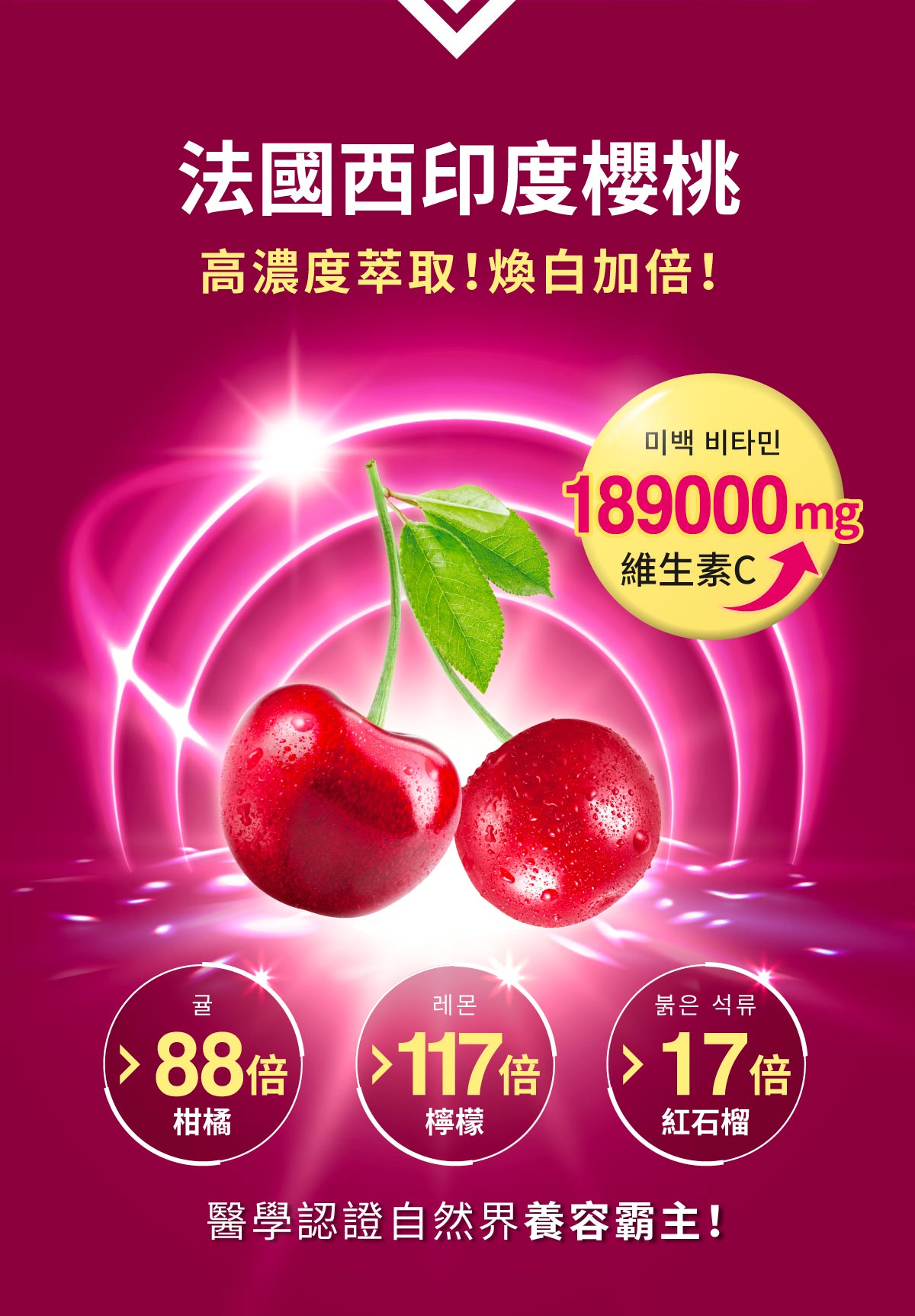 成分 : 法國西印度櫻桃萃取物(含糊精、維生素C、西印度櫻桃萃取)、余甘子萃取物(印度醋栗)、專利26種綜合蔬果酵素粉(含SOD)(含玉米來源可溶性纖維、諾麗果、水蜜桃、荔枝、紅葡萄柚、紅葡萄、蘋果、石榴、番茄、柳橙、蔓越莓、草莓、覆盆莓、櫻桃、黑醋栗、醋栗、白葡萄、胡蘿蔔、百香果、鳳梨、檸檬、綠花椰菜、芹菜、蘆筍、藍莓、楊梅、桑椹)、維生素C、麥芽糊精、葡萄糖酸亞鐵、硬脂酸鎂、專利余甘子萃取物(含余甘子萃取物、二氧化矽)、專利紅石榴萃取物(含石榴萃取、麥芽糊精)、專利膠原蛋白(含膠原三胜肽)、圓酵母萃取物(含穀胱甘肽)(含非活性酵母、糊精)。