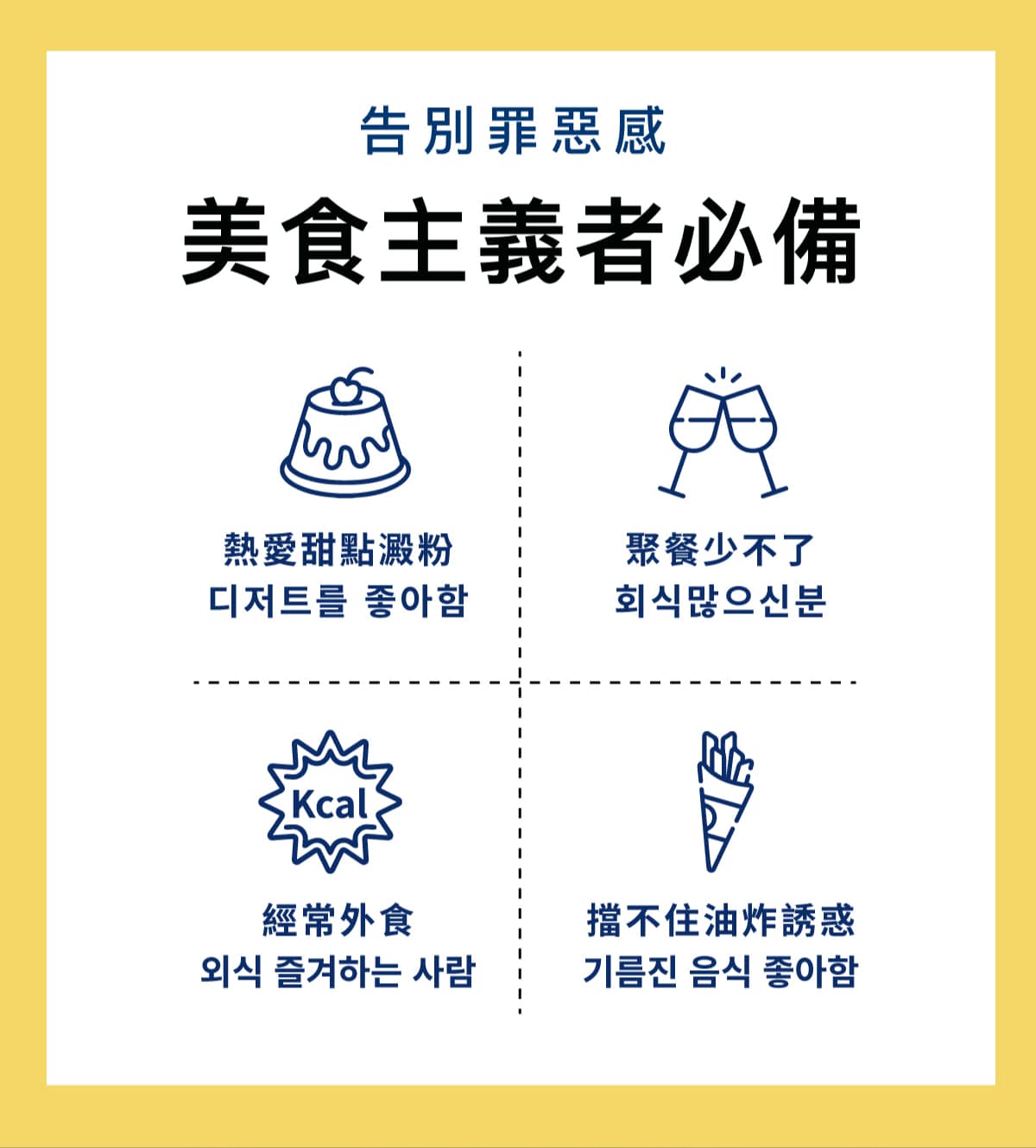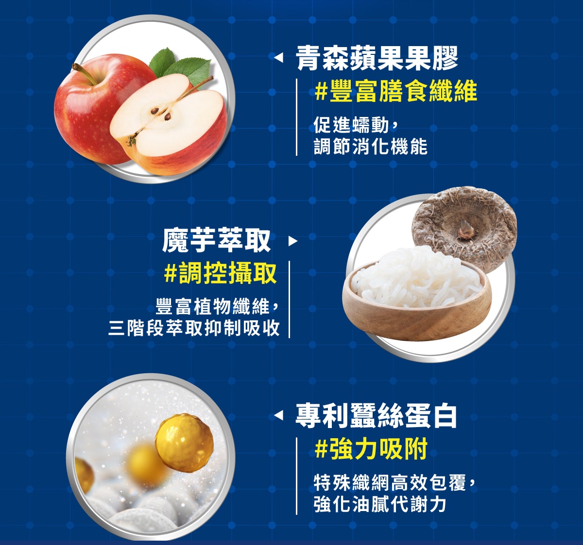 成分 : 白腎豆萃取物、山茶花種子萃取物(山茶花種子萃取、麥芽糊精)、專利瓜拿納萃取物(麥芽糊精、瓜拿納萃取物、咖啡萃取物)、專利黑苦瓜粉、專利蠶絲蛋白(蠶絲蛋白、樹薯糊精)、專利酵母萃取物、專利魔芋萃取物、專利麥盧卡蜂蜜(麥盧卡蜂蜜、麥芽糊精)、專利複合植物萃取(阿拉伯膠、關華豆膠、刺槐豆膠、束絲藻、β-胡蘿蔔素、石榴萃取)、日本專利蘋果果膠(蘋果萃取物、糊精)